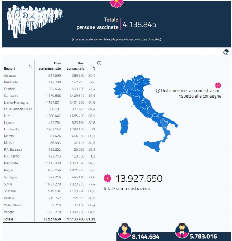Questo il report del Ministero della Salute in merito ai dati delle vaccinazioni anti-covid al 15 aprile. Si può vedere il totale delle somministrazioni, a quante persone è stata già somministrata la seconda dose, il numero di dosi consegnate e somministrate in ogni regione d'Italia. Presente anche il dato ufficiale dell'Asl di Caserta sulle dosi somministrate in provincia.