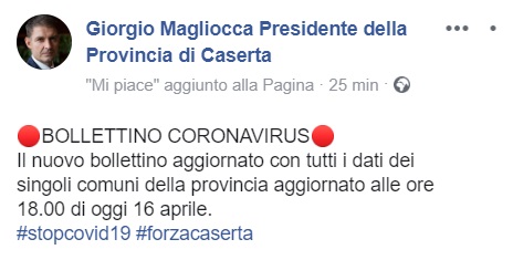 Questo quanto comunicato dal Pres. della Prov. CE Giorgio Magliocca