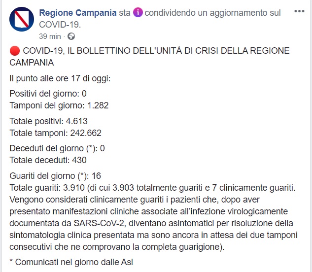 Questo quanto comunicato dalla Regione Campania
