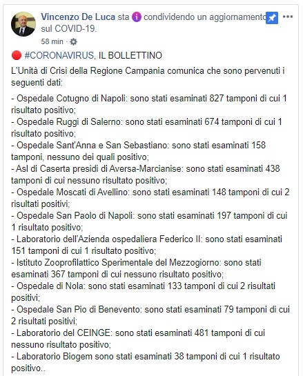 Questo quanto comunicato dal Presidente De Luca