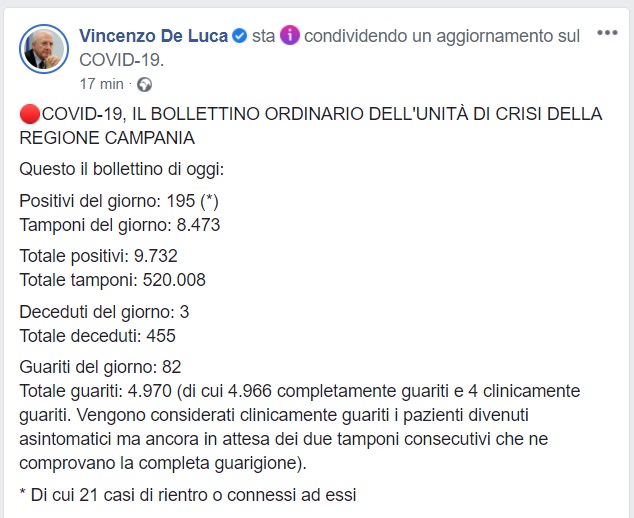 Questo quanto pubblicato da Regione Campania
