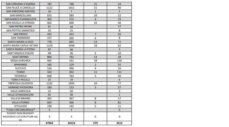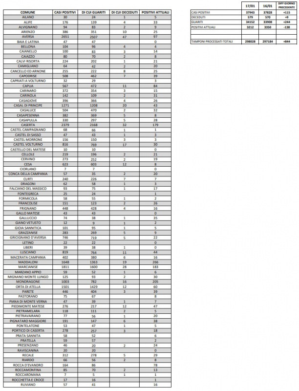 18/01. Coronavirus in Prov. di Caserta. Sono 9 le persone decedute ma diminuiscono i positivi. I dati Comune per Comune