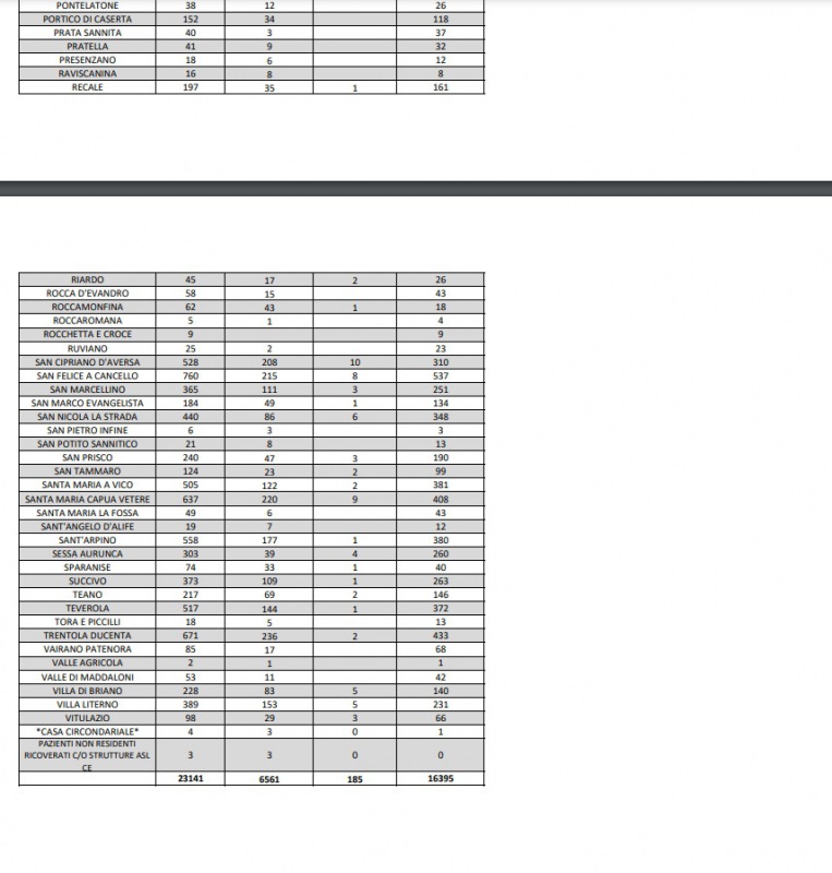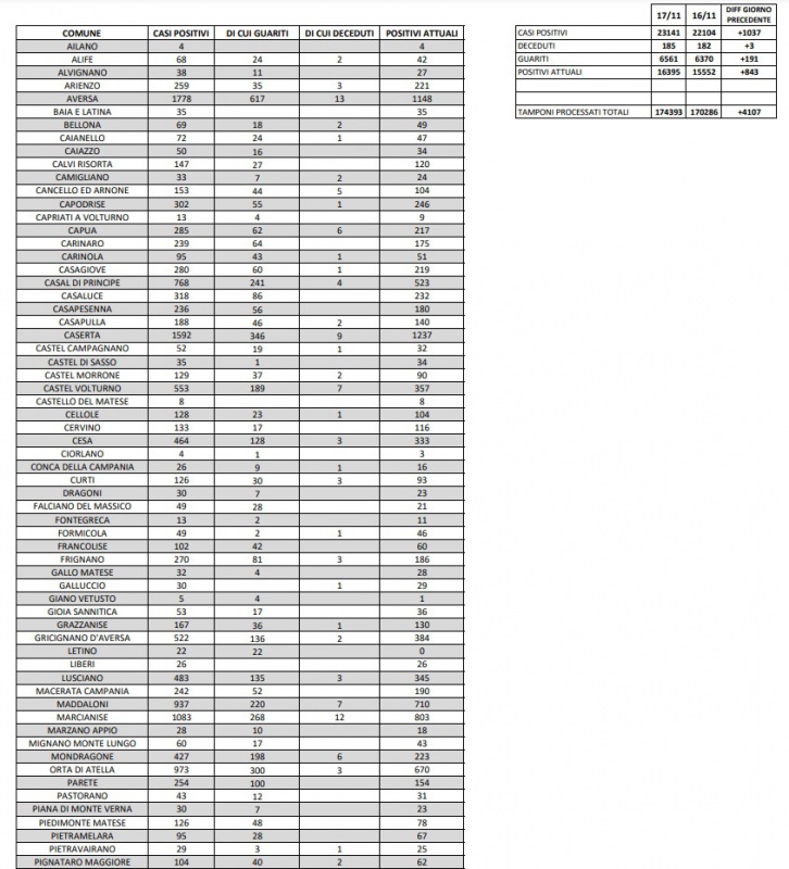 18/11. Nuovi 1.037 casi di Covid-19 nella Prov. di Ce. 16.395 i positivi totali. Dati Comune per Comune