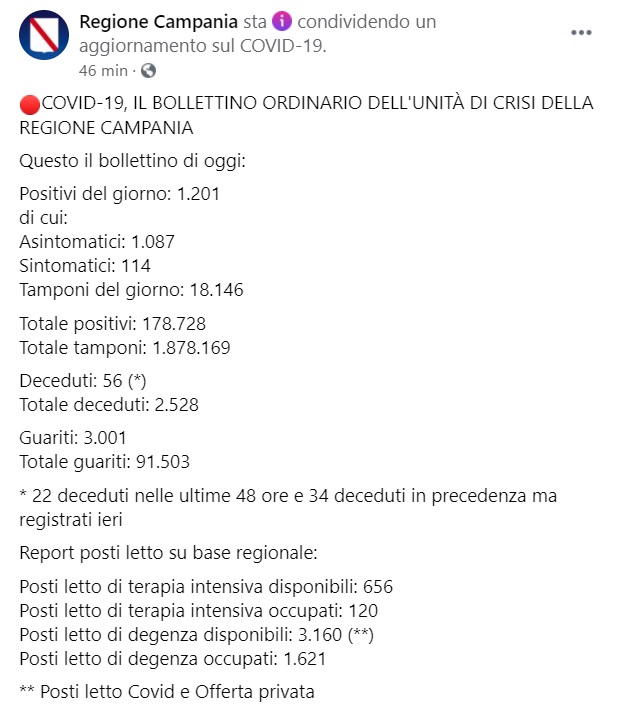 Questo quanto pubblicato sulla pagina facebook della Regione Campania:
