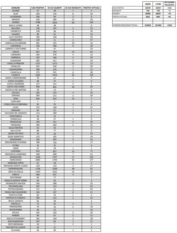 19/02. Coronavirus in Prov. di Caserta. Si registrano 7 decessi e 61 nuovi positivi. I dati Comune per Comune