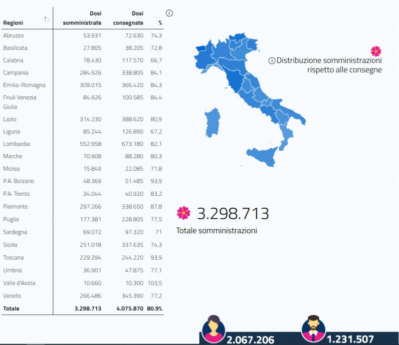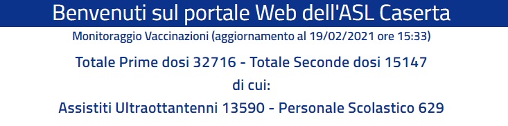 Questo il report del Ministero della Salute in merito ai dati delle vaccinazioni anti-covid al 19 febbraio. Si può vedere il totale delle somministrazioni, a quante persone è stata già somministrata la seconda dose, il numero di dosi consegnate e somministrate in ogni regione d'Italia. Presente anche il dato ufficiale dell'Asl di Caserta sulle dosi somministrate in provincia.