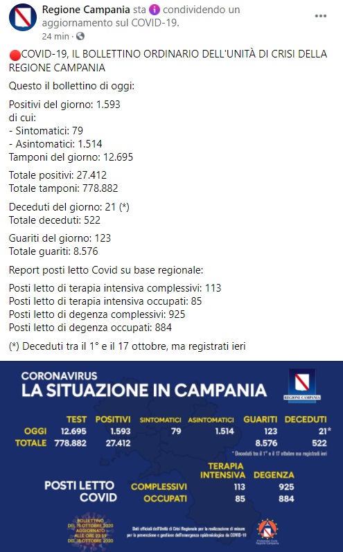Questo quanto pubblicato sulla pagina facebook della Regione Campania: