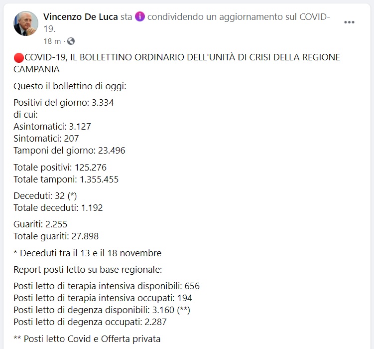 Questo quanto pubblicato sulla pagina fb del Governatore De Luca