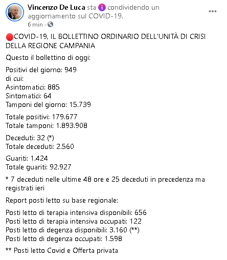 Lo apprendiamo dalla pagina Facebook del Presidente della Regione Campania, Vincenzo De Luca.