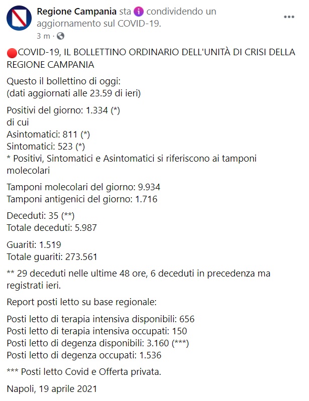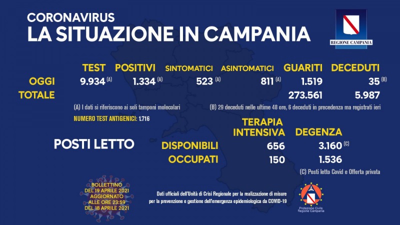 COVID-19, IL BOLLETTINO ORDINARIO DELL'UNITÀ DI CRISI DELLA REGIONE CAMPANIA Questo il bollettino di oggi: (dati aggiornati alle 23.59 di ieri) Positivi del giorno: 1.334 (*) di cui Asintomatici: 811 (*) Sintomatici: 523 (*) * Positivi, Sintomatici e Asintomatici si riferiscono ai tamponi molecolari Tamponi molecolari del giorno: 9.934 Tamponi antigenici del giorno: 1.716 Deceduti: 35 (**) Totale deceduti: 5.987 Guariti: 1.519 Totale guariti: 273.561 ** 29 deceduti nelle ultime 48 ore, 6 deceduti in precedenza ma registrati ieri. Report posti letto su base regionale: Posti letto di terapia intensiva disponibili: 656 Posti letto di terapia intensiva occupati: 150 Posti letto di degenza disponibili: 3.160 (***) Posti letto di degenza occupati: 1.536 *** Posti letto Covid e Offerta privata. Napoli, 19 aprile 2021