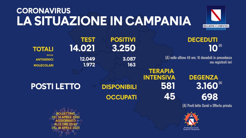 "Questo il bollettino di oggi: (dati aggiornati alle 23.59 di ieri) Positivi del giorno: 3.250 di cui: Positivi all'antigenico: 3.087 Positivi al molecolare: 163 Test: 14.021 di cui: Antigenici: 12.049 Molecolari: 1.972 Deceduti: 10 (*) nelle ultime 48 ore; 10 deceduti in precedenza ma registrati ieri Report posti letto su base regionale: -Si legge nella nota- Posti letto di terapia intensiva disponibili: 581 Posti letto di terapia intensiva occupati: 45 Posti letto di degenza disponibili: 3.160 (*) Posti letto di degenza occupati: 698 (*) Posti letto Covid e Offerta privata. I dati sulle vaccinazioni sono disponibili al link: http://vaccinicovid19.regione.campania.it/e_vaccini-anti... Napoli, 19 aprile 2022"