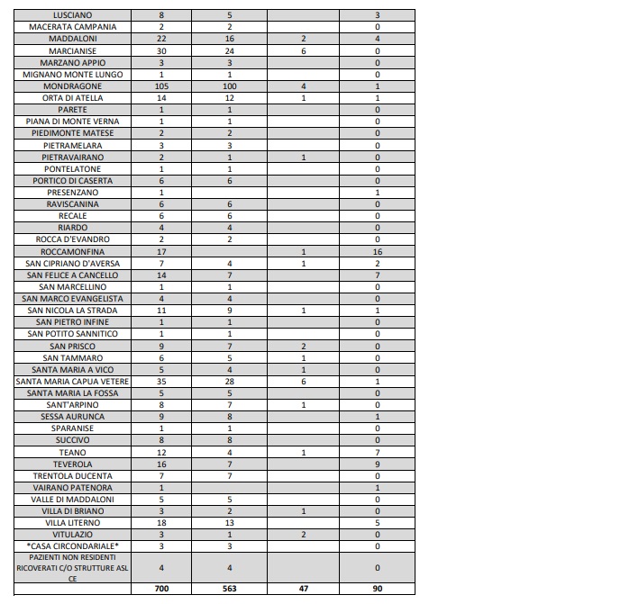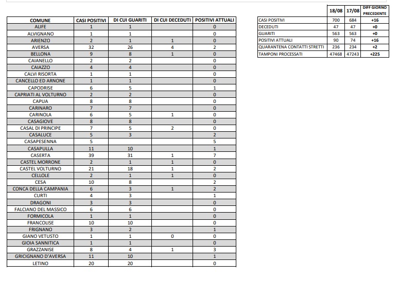 19/8. Ci sono 16 nuovi casi di Covid-19 nella Prov. di Ce. 90 i positivi totali. Dati Comune per Comune