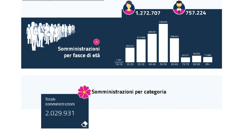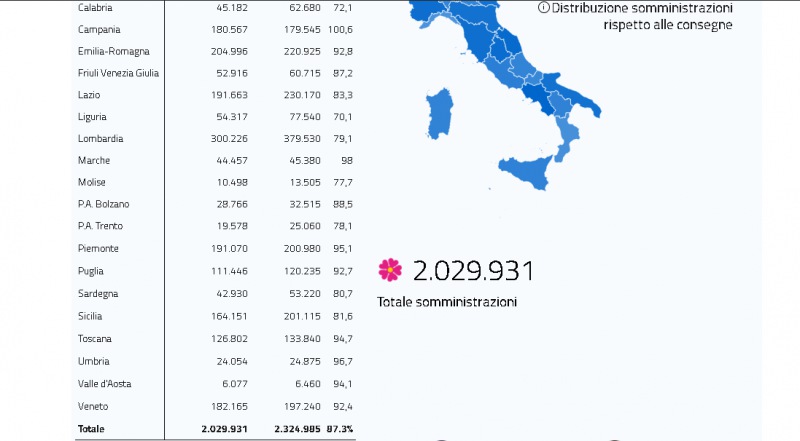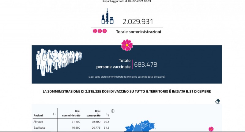 Questo il report del Ministero della Salute in merito ai dati delle vaccinazioni anti-covid al 2 febbraio. Si può vedere il totale delle somministrazioni, a quante persone è stata già somministrata la seconda dose, il numero di dosi consegnate e somministrate in ogni regione d'Italia. Presente anche il dato ufficiale dell'Asl di Caserta sulle dosi somministrate in provincia.