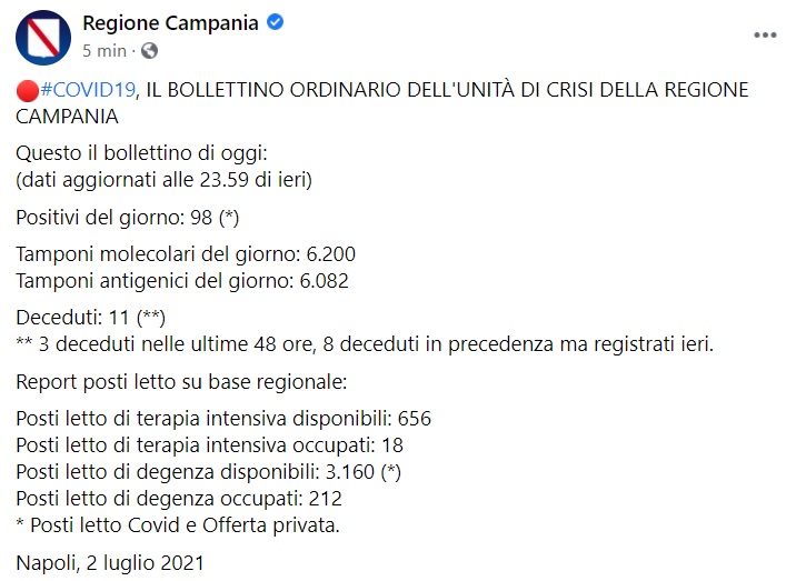 "#COVID19, IL BOLLETTINO ORDINARIO DELL'UNITÀ DI CRISI DELLA REGIONE CAMPANIA Questo il bollettino di oggi: (dati aggiornati alle 23.59 di ieri) Positivi del giorno: 98 (*) Tamponi molecolari del giorno: 6.200 Tamponi antigenici del giorno: 6.082 Deceduti: 11 (**) ** 3 deceduti nelle ultime 48 ore, 8 deceduti in precedenza ma registrati ieri. Report posti letto su base regionale: Posti letto di terapia intensiva disponibili: 656 Posti letto di terapia intensiva occupati: 18 Posti letto di degenza disponibili: 3.160 (*) Posti letto di degenza occupati: 212 * Posti letto Covid e Offerta privata. Napoli, 2 luglio 2021"