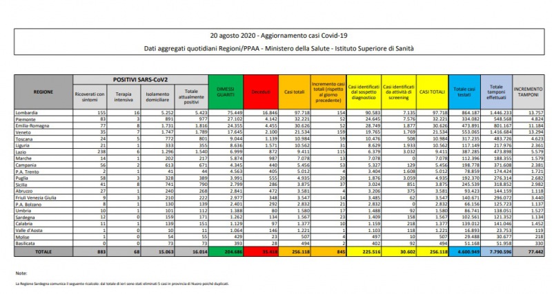 Questi i dati del Ministero della Salute: