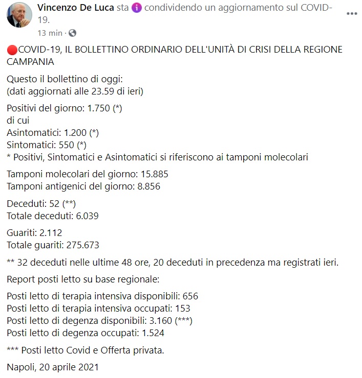 Questo quanto pubblicato sulla pagina fb del Pres. De Luca: "COVID-19, IL BOLLETTINO ORDINARIO DELL'UNITÀ DI CRISI DELLA REGIONE CAMPANIA Questo il bollettino di oggi: (dati aggiornati alle 23.59 di ieri) Positivi del giorno: 1.750 (*) di cui Asintomatici: 1.200 (*) Sintomatici: 550 (*) * Positivi, Sintomatici e Asintomatici si riferiscono ai tamponi molecolari Tamponi molecolari del giorno: 15.885 Tamponi antigenici del giorno: 8.856 Deceduti: 52 (**) Totale deceduti: 6.039 Guariti: 2.112 Totale guariti: 275.673 ** 32 deceduti nelle ultime 48 ore, 20 deceduti in precedenza ma registrati ieri. Report posti letto su base regionale: Posti letto di terapia intensiva disponibili: 656 Posti letto di terapia intensiva occupati: 153 Posti letto di degenza disponibili: 3.160 (***) Posti letto di degenza occupati: 1.524 *** Posti letto Covid e Offerta privata. Napoli, 20 aprile 2021"