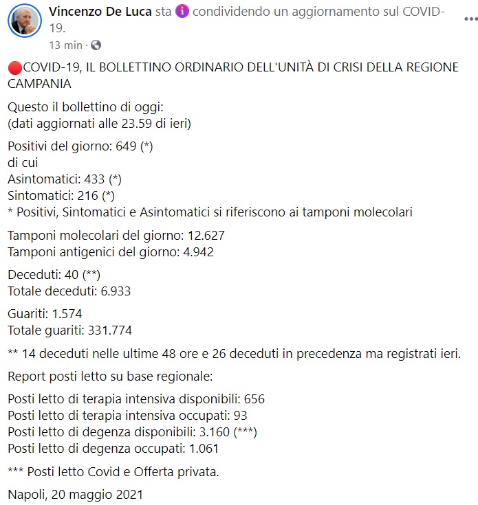 Questo quanto pubblicato sulla pagina fb del Pres. De Luca: "COVID-19, IL BOLLETTINO ORDINARIO DELL'UNITÀ DI CRISI DELLA REGIONE CAMPANIA Questo il bollettino di oggi: (dati aggiornati alle 23.59 di ieri) Positivi del giorno: 649 (*) di cui Asintomatici: 433 (*) Sintomatici: 216 (*) * Positivi, Sintomatici e Asintomatici si riferiscono ai tamponi molecolari Tamponi molecolari del giorno: 12.627 Tamponi antigenici del giorno: 4.942 Deceduti: 40 (**) Totale deceduti: 6.933 Guariti: 1.574 Totale guariti: 331.774 ** 14 deceduti nelle ultime 48 ore e 26 deceduti in precedenza ma registrati ieri. Report posti letto su base regionale: Posti letto di terapia intensiva disponibili: 656 Posti letto di terapia intensiva occupati: 93 Posti letto di degenza disponibili: 3.160 (***) Posti letto di degenza occupati: 1.061 *** Posti letto Covid e Offerta privata. Napoli, 20 maggio 2021"