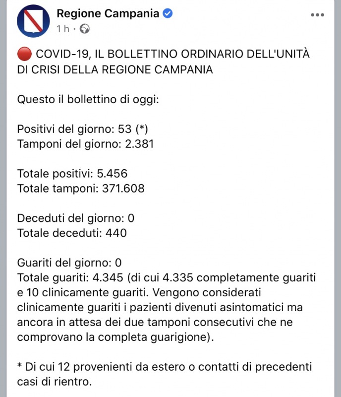 Questo quanto comunicato da Regione Campania
