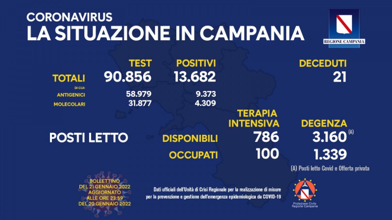 "Questo il bollettino di oggi: (dati aggiornati alle 23.59 di ieri) Positivi del giorno: 13.682 (*) di cui: Positivi all'antigenico: 9.373 Positivi al molecolare: 4.309 (*) I dati tengono conto dell'Aggiornamento sulle misure di quarantena e isolamento del Ministero della Salute. -Si legge nella nota- Test: 90.856 di cui: Antigenici: 58.979 Molecolari: 31.877 Deceduti: 21 Report posti letto su base regionale: Posti letto di terapia intensiva disponibili: 786 Posti letto di terapia intensiva occupati: 100 Posti letto di degenza disponibili: 3.160 (*) Posti letto di degenza occupati: 1.339 (*) Posti letto Covid e Offerta privata. Napoli, 21 gennaio 2022"