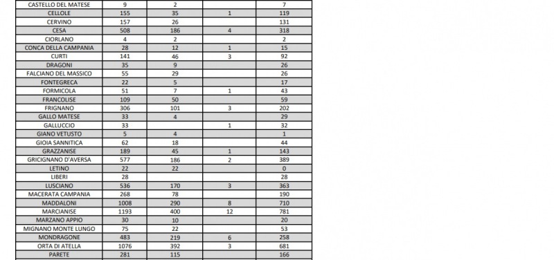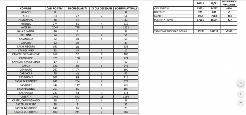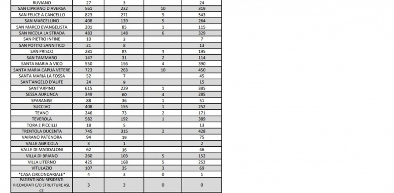 21/11. Agg. Coronavirus Prov. CE. 17.001 i positivi totali. Dati Comune per Comune