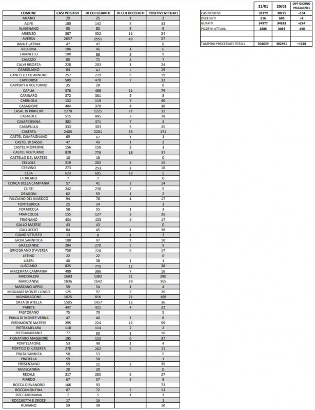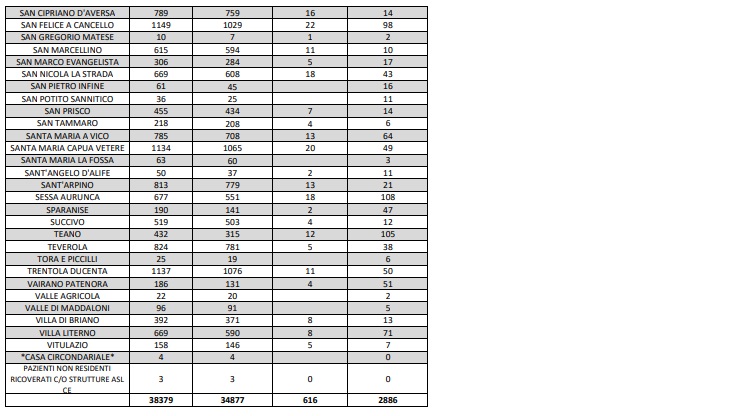 Questi i dati dell'Asl di Caserta: