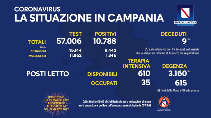 "Questo il bollettino di oggi: (dati aggiornati alle 23.59 di ieri) Positivi del giorno: 10.788 (*) di cui: Positivi all'antigenico: 9.442 Positivi al molecolare: 1.346 (*) I dati tengono conto dell'Aggiornamento sulle misure di quarantena e isolamento del Ministero della Salute. -Si legge nella nota- Test: 57.006 di cui: Antigenici: 45.144 Molecolari: 11.862 Deceduti: 9 (*) nelle ultime 48 ore; 15 deceduti nel periodo che va dal primo febbraio al 19 marzo ma registrati ieri.%u200B Report posti letto su base regionale: Posti letto di terapia intensiva disponibili: 610 Posti letto di terapia intensiva occupati: 35 Posti letto di degenza disponibili: 3.160 (*) Posti letto di degenza occupati: 615 (*) Posti letto Covid e Offerta privata. Napoli, 22 marzo 2022"