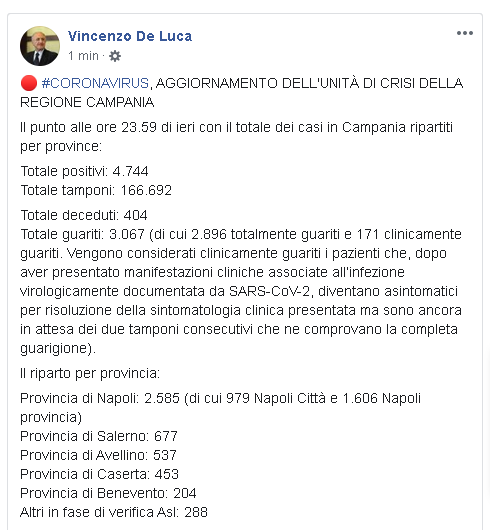 Lo apprendiamo dalla pagina Facebook del Governatore della Regione Campania, Vincenzo De Luca: