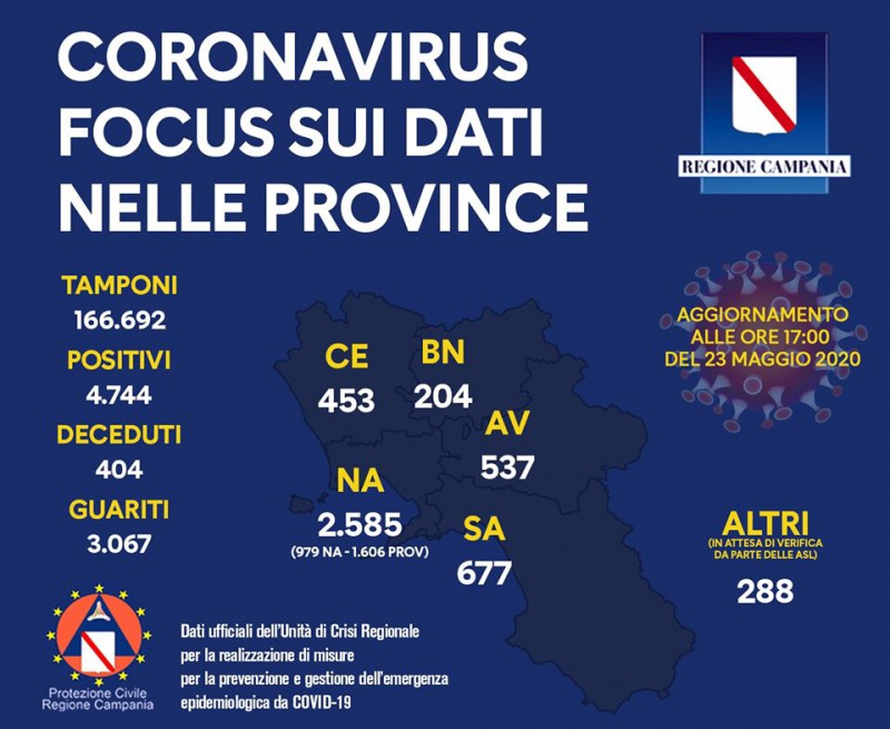 Il punto alle ore 23.59 di ieri con il totale dei casi in Campania ripartiti per province: