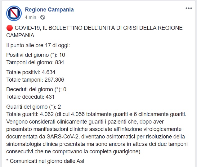 Questo quanto comunicato dalla Regione Campania