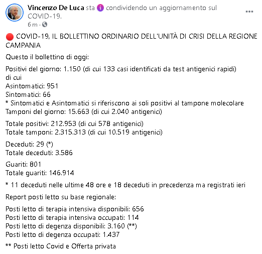 Lo apprendiamo dalla pagina Facebook del Presidente della Regione Campania, Vincenzo De Luca:
