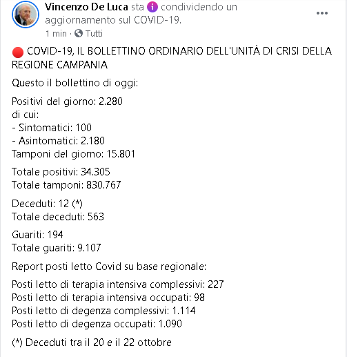 23/10. Agg. Coronavirus in CAMPANIA. 2280 POSITIVI OGGI, 12 I DECEDUTI
