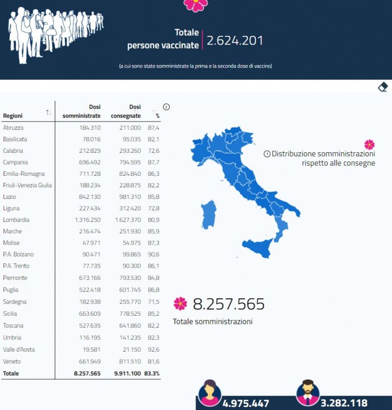 Questo il report del Ministero della Salute in merito ai dati delle vaccinazioni anti-covid al 24 marzo. Si può vedere il totale delle somministrazioni, a quante persone è stata già somministrata la seconda dose, il numero di dosi consegnate e somministrate in ogni regione d'Italia. Presente anche il dato ufficiale dell'Asl di Caserta sulle dosi somministrate in provincia.