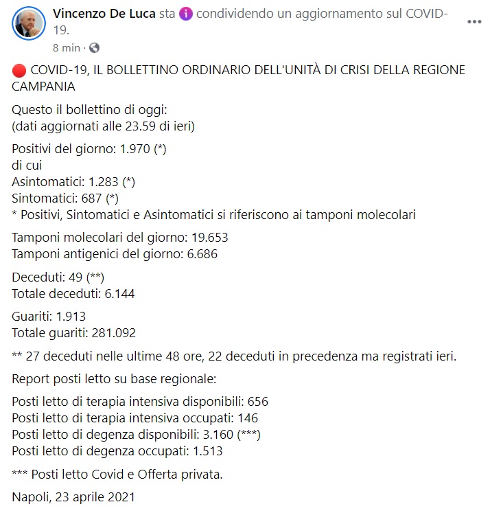 "Questo il bollettino di oggi: (dati aggiornati alle 23.59 di ieri) Positivi del giorno: 1.970 (*) di cui Asintomatici: 1.283 (*) Sintomatici: 687 (*) * Positivi, Sintomatici e Asintomatici si riferiscono ai tamponi molecolari Tamponi molecolari del giorno: 19.653 Tamponi antigenici del giorno: 6.686 Deceduti: 49 (**) Totale deceduti: 6.144 Guariti: 1.913 Totale guariti: 281.092 ** 27 deceduti nelle ultime 48 ore, 22 deceduti in precedenza ma registrati ieri. Report posti letto su base regionale: Posti letto di terapia intensiva disponibili: 656 Posti letto di terapia intensiva occupati: 146 Posti letto di degenza disponibili: 3.160 (***) Posti letto di degenza occupati: 1.513 *** Posti letto Covid e Offerta privata. Napoli, 23 aprile 2021"