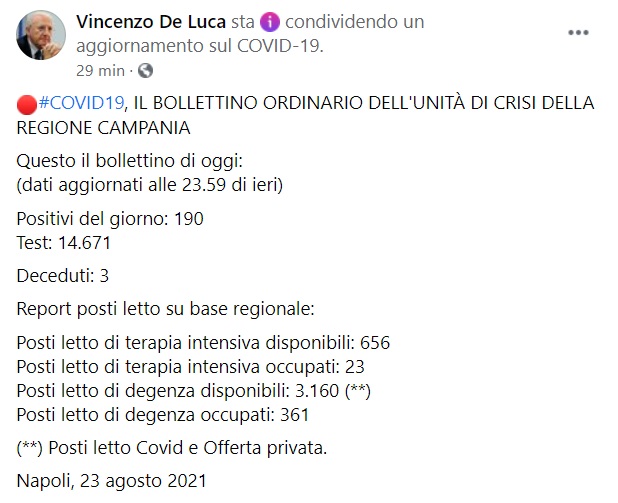 "Questo il bollettino di oggi: (dati aggiornati alle 23.59 di ieri) Positivi del giorno: 190 Test: 14.671 Deceduti: 3 Report posti letto su base regionale: Posti letto di terapia intensiva disponibili: 656 Posti letto di terapia intensiva occupati: 23 Posti letto di degenza disponibili: 3.160 (**) Posti letto di degenza occupati: 361 (**) Posti letto Covid e Offerta privata. Napoli, 23 agosto%u200B 2021"