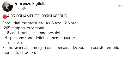 Lo apprendiamo dalla pagina Facebook di Vincenzo Figliolia, Sindaco di Pozzuoli: