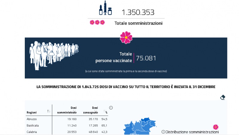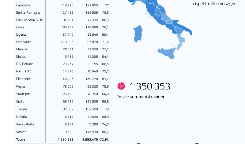 Questo il report del Ministero della Salute in merito ai dati delle vaccinazioni anti-covid al 24 gennaio. Si può vedere il totale delle somministrazioni, a quante persone è stata già somministrata la seconda dose, il numero di dosi consegnate e somministrate in ogni regione d'Italia. Presente anche il dato ufficiale dell'Asl di Caserta sulle dosi somministrate in provincia.