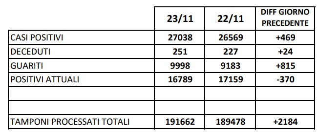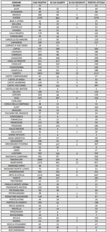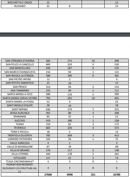 24/11. Agg. Covid Prov. CE. 469 NUOVI POSITIVI. 1210 solo ad AVERSA, Dati ASL Comune per Comune