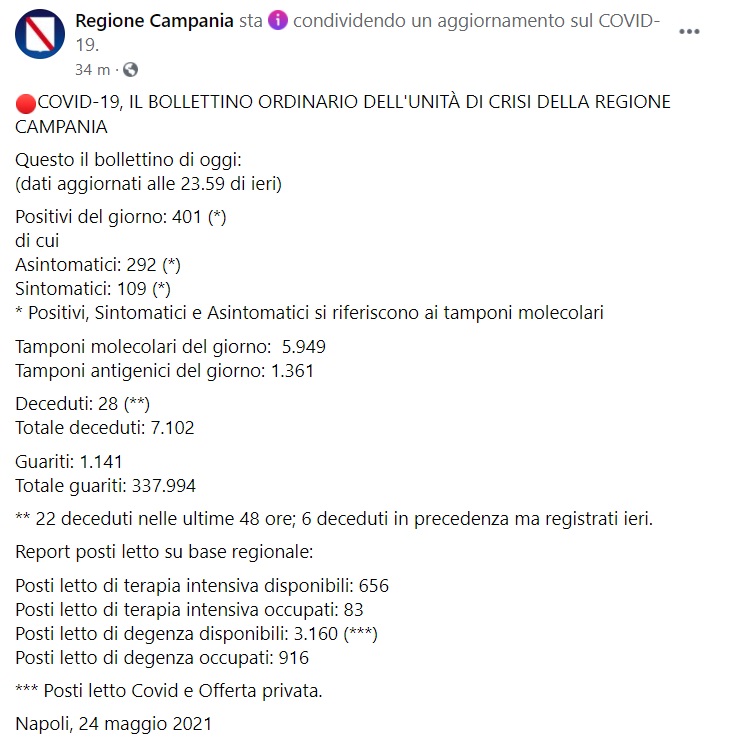 "Questo il bollettino di oggi: (dati aggiornati alle 23.59 di ieri) Positivi del giorno: 401 (*) di cui Asintomatici: 292 (*) Sintomatici: 109 (*) * Positivi, Sintomatici e Asintomatici si riferiscono ai tamponi molecolari Tamponi molecolari del giorno: 5.949 Tamponi antigenici del giorno: 1.361 Deceduti: 28 (**) Totale deceduti: 7.102 Guariti: 1.141 Totale guariti: 337.994 ** 22 deceduti nelle ultime 48 ore; 6 deceduti in precedenza ma registrati ieri. Report posti letto su base regionale: Posti letto di terapia intensiva disponibili: 656 Posti letto di terapia intensiva occupati: 83 Posti letto di degenza disponibili: 3.160 (***) Posti letto di degenza occupati: 916 *** Posti letto Covid e Offerta privata. Napoli, 24 maggio 2021"