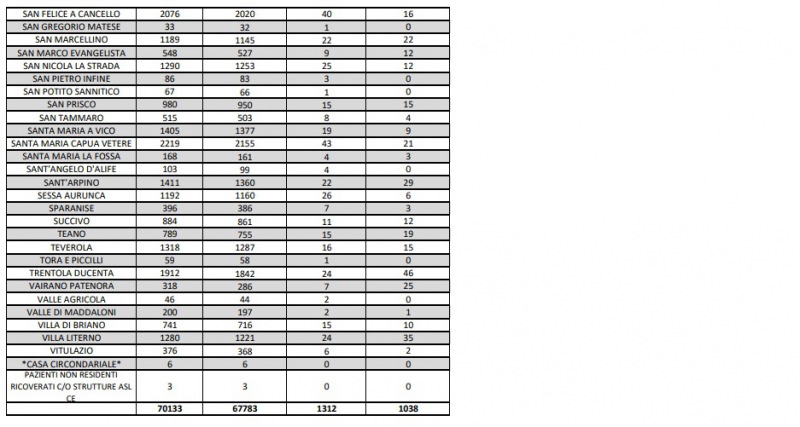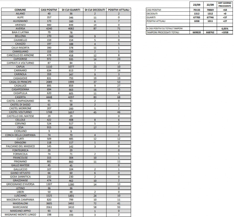 24/9. Coronavirus in Prov. di Ce. Si registrano 64 nuovi casi. I dati Comune per Comune