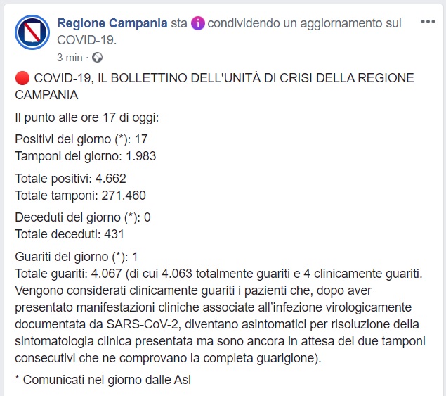 Questo quanto comunicato dalla Regione Campania
