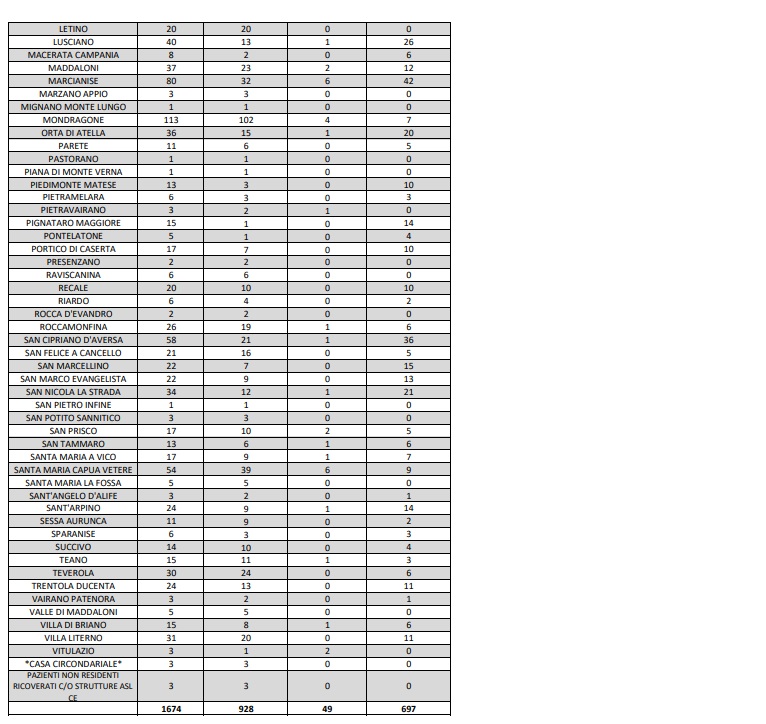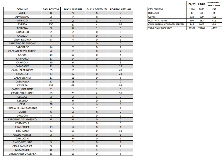 25/09. Coronavirus Prov. di Ce. Salgono a 697 i contagi. I dati Comune per Comune