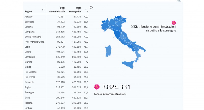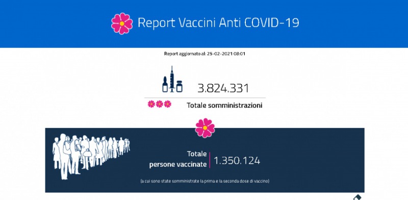 Questo il report del Ministero della Salute in merito ai dati delle vaccinazioni anti-covid al 25 febbraio. Si può vedere il totale delle somministrazioni, a quante persone è stata già somministrata la seconda dose, il numero di dosi consegnate e somministrate in ogni regione d'Italia. Presente anche il dato ufficiale dell'Asl di Caserta sulle dosi somministrate in provincia.
