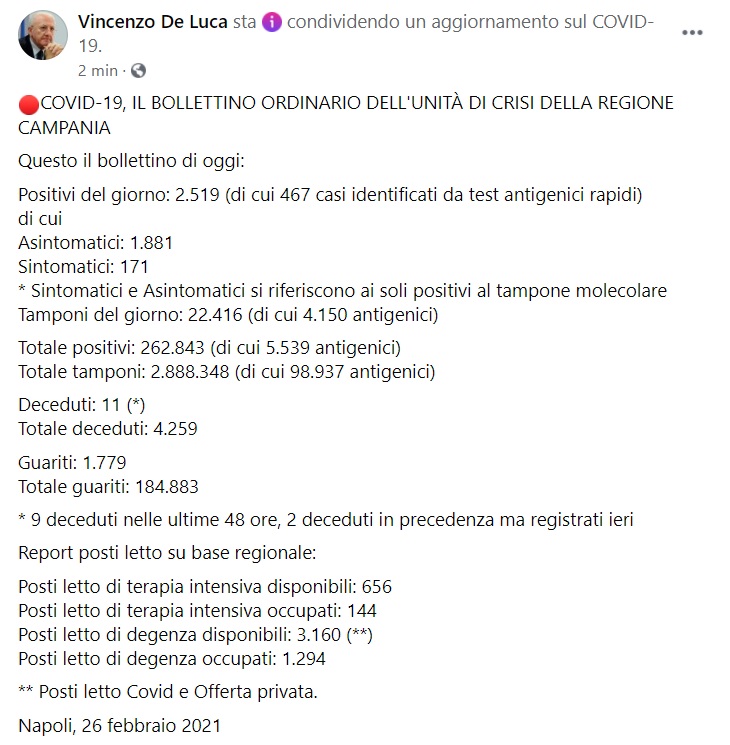 "Questo il bollettino di oggi: Positivi del giorno: 2.519 (di cui 467 casi identificati da test antigenici rapidi) di cui Asintomatici: 1.881 Sintomatici: 171 * Sintomatici e Asintomatici si riferiscono ai soli positivi al tampone molecolare Tamponi del giorno: 22.416 (di cui 4.150 antigenici) Totale positivi: 262.843 (di cui 5.539 antigenici) Totale tamponi: 2.888.348 (di cui 98.937 antigenici) Deceduti: 11 (*) Totale deceduti: 4.259 Guariti: 1.779 Totale guariti: 184.883 * 9 deceduti nelle ultime 48 ore, 2 deceduti in precedenza ma registrati ieri Report posti letto su base regionale: Posti letto di terapia intensiva disponibili: 656 Posti letto di terapia intensiva occupati: 144 Posti letto di degenza disponibili: 3.160 (**) Posti letto di degenza occupati: 1.294 ** Posti letto Covid e Offerta privata. Napoli, 26 febbraio 2021"