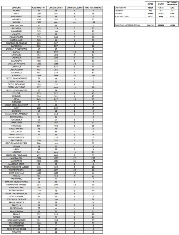 26/02. Coronavirus in Prov. di Caserta. Si registrano 3 decessi e 291 nuovi positivi. I dati Comune per Comune