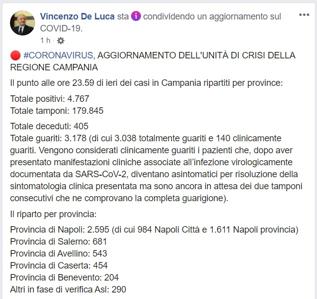 26/05. Agg. Coronavirus. Il riparto per Provincia