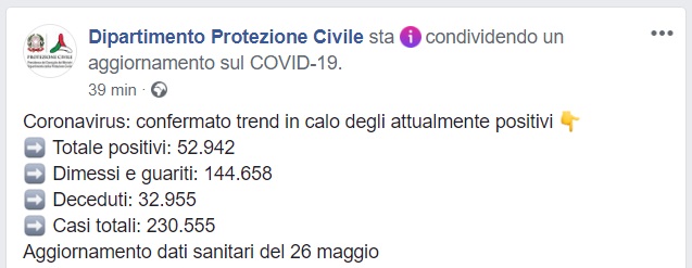 Questo quanto comunicato dalla Prot. Civile