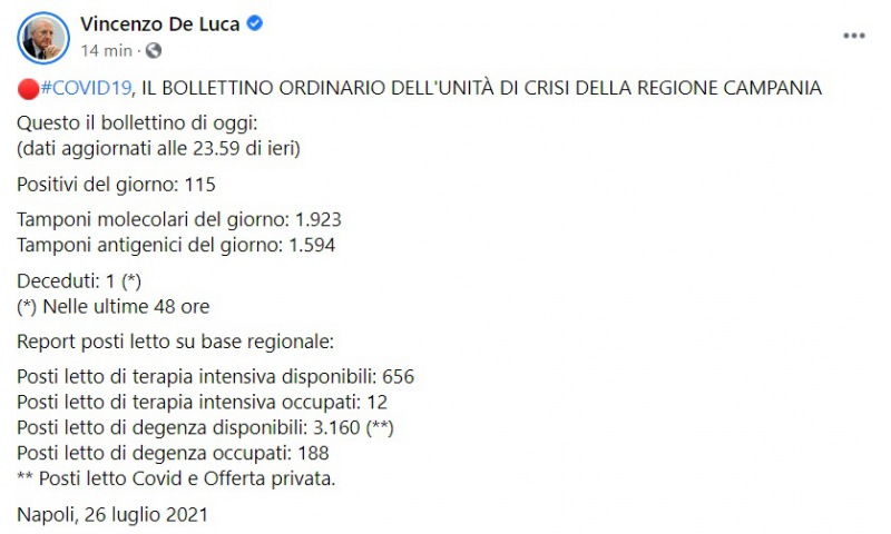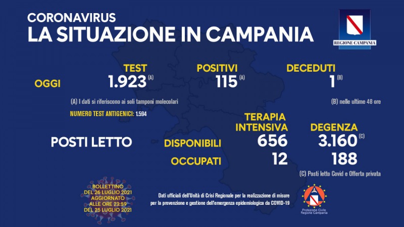 "Questo il bollettino di oggi: (dati aggiornati alle 23.59 di ieri) Positivi del giorno: 115 Tamponi molecolari del giorno: 1.923 Tamponi antigenici del giorno: 1.594 Deceduti: 1 (*) (*) Nelle ultime 48 ore Report posti letto su base regionale: Posti letto di terapia intensiva disponibili: 656 Posti letto di terapia intensiva occupati: 12 Posti letto di degenza disponibili: 3.160 (**) Posti letto di degenza occupati: 188 ** Posti letto Covid e Offerta privata. Napoli, 26 luglio 2021"