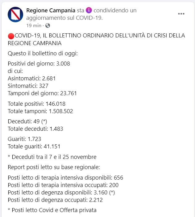 Questo quanto pubblicato sulla pagina facebook della Regione Campania