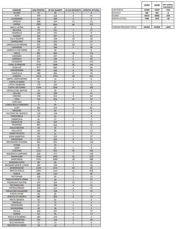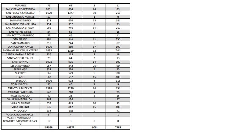 Questi i dati dell'Asl di Caserta: