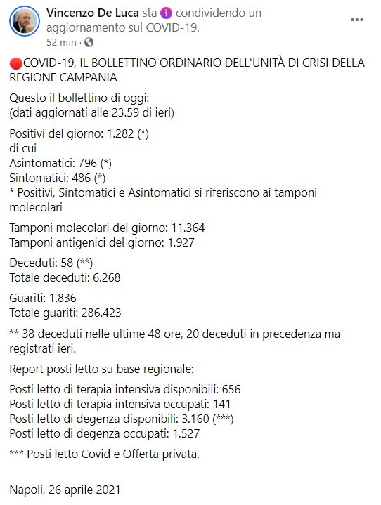 "Questo il bollettino di oggi: (dati aggiornati alle 23.59 di ieri) Positivi del giorno: 1.282 (*) di cui Asintomatici: 796 (*) Sintomatici: 486 (*) * Positivi, Sintomatici e Asintomatici si riferiscono ai tamponi molecolari Tamponi molecolari del giorno: 11.364 Tamponi antigenici del giorno: 1.927 %u200BDeceduti: 58 (**)%u200B Totale deceduti: 6.268 Guariti: 1.836 Totale guariti: 286.423 ** 38 deceduti nelle ultime 48 ore, 20 deceduti in precedenza ma registrati ieri. %u200BReport posti letto su base regionale: Posti letto di terapia intensiva disponibili: 656 Posti letto di terapia intensiva occupati: 141 Posti letto di degenza disponibili: 3.160 (***) Posti letto di degenza occupati: 1.527 *** Posti letto Covid e Offerta privata. %u200B Napoli, 26 aprile 2021"